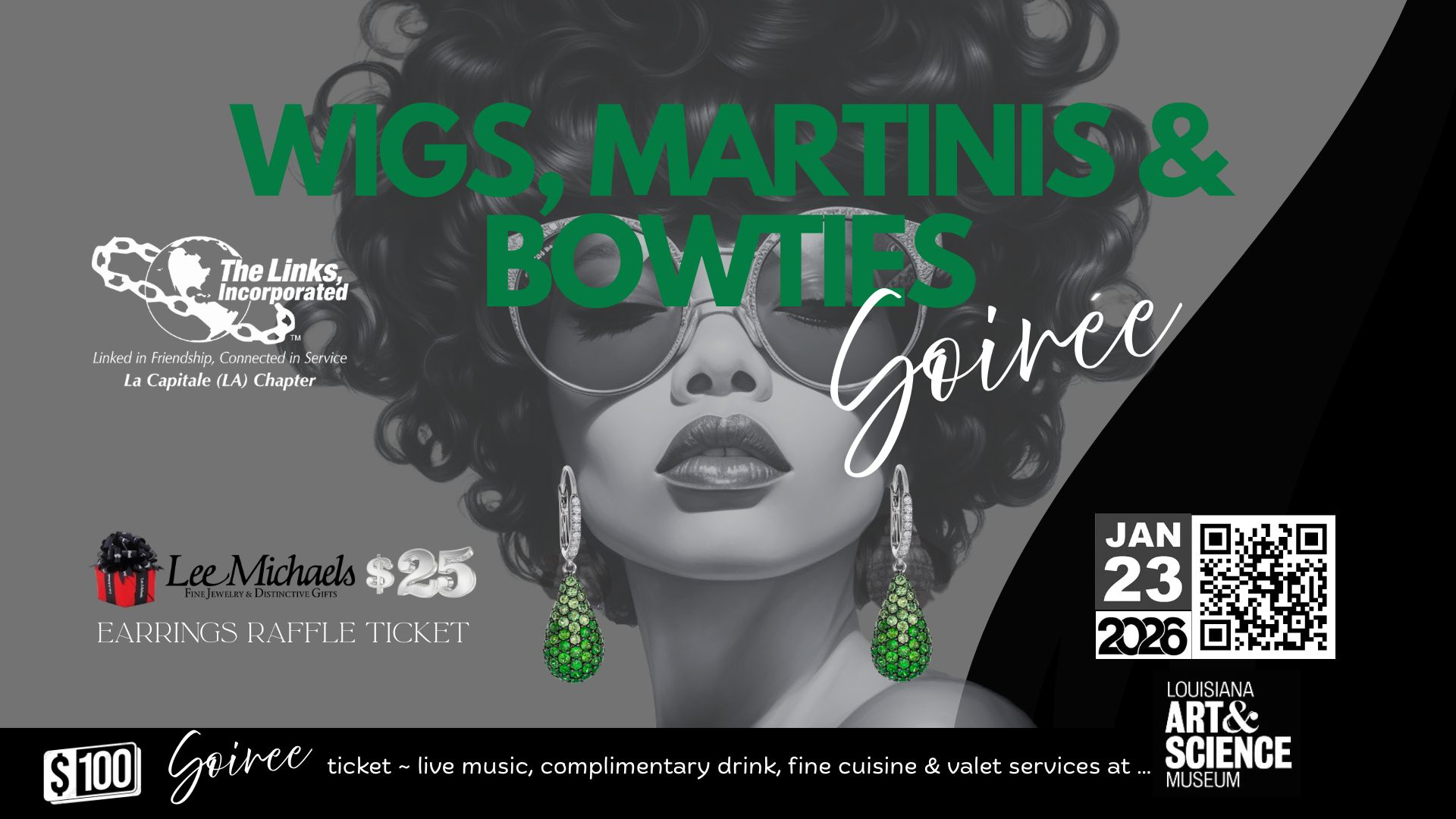 “Wigs, Martinis, & Bowties'' will be a unique and memorable affair, blending the charm and elegance. This event will attract a diverse crowd of 400 attendees, including local influencers, professionals, and stakeholders. Additionally, the winning Soiree raffle ticket holder will receive a luxurious green tsavorite diamond drop earrings valued at $3000 from Lee Michaels Fine Jewelry. Lastly, our event will feature the Michael Foster Project to create an unforgettable evening of entertainment.